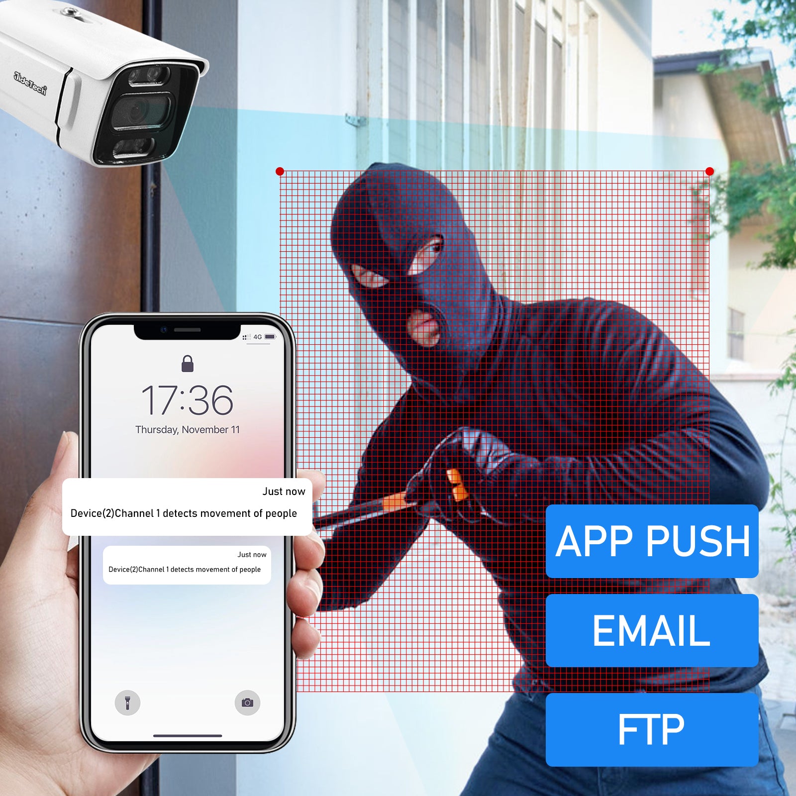 Motion Detection; humanoid detection, alarm push (mobile phone APP alarm push, NVR alarm prompt) |